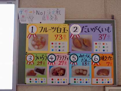デザートナンバーワン決定戦 公開日 2022/02/15 更新日 2022/02/15 お知らせ 給食がんばり週間にデザートナンバーワン決定戦を実施していました。子どもたちが給食のデザートから最も気に入った献立を選びます。1位は、「フルーツ白玉」でした。どの学年からも幅広い支持を得たようです。 ご家庭でのメニューを考えるのに活かしてください。 いいね(0)