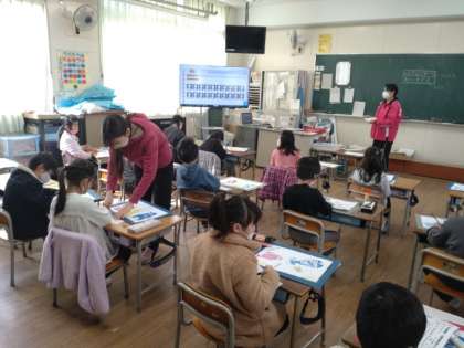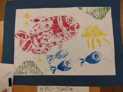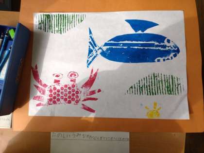 紙版画 公開日 2022/02/15 更新日 2022/02/15 お知らせ 1年1組では図画工作科で作った紙版画に、作品名と自分の名前を書いていました。テーマは「海」のようです。赤・青・黄、きれいな色の魚が泳いでいます。クラゲやエビ、カニ、サンゴ、海草など、とてもにぎやかな海です。 まるで国語科で学習した「スイミー」の世界を表しているようでした。 いいね(0)