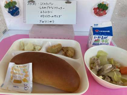 2月17日(木)の給食は、黒糖パン・牛乳・白身魚フリッター・洋風煮・カリフラワーのサラダです。フリッターとは、小麦粉や泡立てた卵白などで作った衣をつけて、油で揚げたもののことです。衣に色をつけないように低い温度で揚げます。給食の白身魚フリッターは、白身魚の「たら」を使っています。また、衣に卵は使っていません。カリッとした衣、中にはふわっとしたタラの身、この組み合わせでとても美味しい一品になっています。