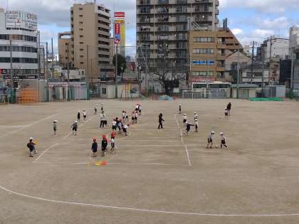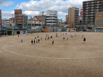 1年生は体育科で「ボールけりあそび」に取り組んでいます。まずは、体を温めるために、ボールをけりながら運動場を何周も走ります。