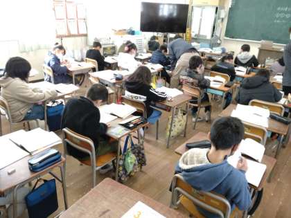 3年生は算数科の時間に「3年のまとめ」に取り組んでいました。前半は、数のしくみやかけ算・わり算などの計算問題、後半は、分数・長さや重さの単位・円や円周についての問題でした。