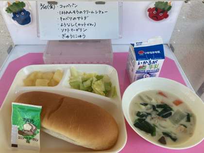 2月25日(金)の給食は、コッペパン・ソフトマーガリン・牛乳・ほうれんそうのクリームシチュー・キャベツのサラダです。本日のほうれんそうのクリームシチューに使われているクリームは、生乳から乳脂肪分が多い部分を取り出したもので、「生クリーム」とも呼ばれています。生乳を加熱・殺菌したものは牛乳になります。濃厚な生クリームで作られたクリームシチューはとても美味しいです。