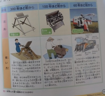 残った時間、「米作りに使う道具の移り変わり」についても学習しました。脱穀にピンとこない様子でしたが、この道具にも人間の知恵や工夫が表れているので、知っておいてほしいと思います。