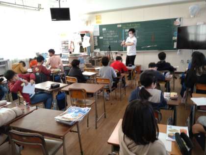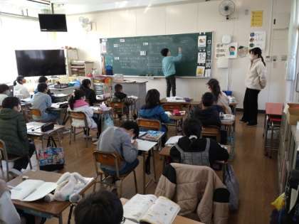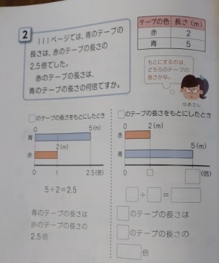 4年生は算数科で「小数のかけ算とわり算のしかたを考えよう」」の学習をしています。本時では、下記のような問題で、もとにする量が変わったら、何倍はどうなるかについて考えました。「赤のテープの長さは、青のテープの長さの何倍ですか。」の問いで、基にするのはどちらのテープなのかを見極めなければいけません。難問ですが、相談しながら粘り強く考えていました。