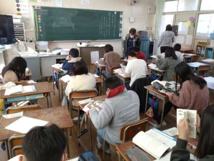 5年生は国語科で、手塚治虫の伝記について学習してきました。本時からは、印象に残った人物の伝記を読んで感想文を書きます。早速伝記を読みながら、作文メモを書き始めていました。最近は歴史上の人物について描かれた漫画が普及しているので、それを基に書いている児童が少なくありませんでした。伝記を通して主人公の生き様から学んでほしいと思います。