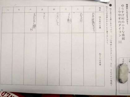 時を表す言葉 公開日 2022/03/01 更新日 2022/03/01 お知らせ 3年生は国語科で「ゆうすげ村の小さな旅館」を学習しています。前時までに、物語文を32の形式段落に分けました。本時では、さらに8つの意味段落に分けていきました。キーとなる言葉は「時を表す言葉」のようです。「わか葉のきせつ」「ある日」「よく朝」「こうして」「またたく間に」「よく日」子どもたちは、これらの言葉を探し出して分けていきました。 さあ次は、意味段落ごとに起きた出来事をまとめていきます。 いいね(0)