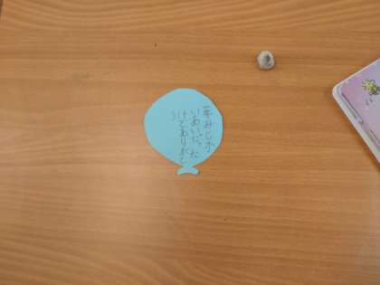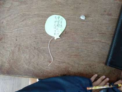 6年生に 1 公開日 2022/03/01 更新日 2022/03/01 お知らせ 1年1組では学級活動の時間に「卒業する6年生へ送るメッセージ」を書いていました。風船にメッセージと名前を書き込んでいます。「中学校でもがんばってください、」「きゅうしょくのとき、おせわになりました。」子どもたちは一人ひとり心を込めて丁寧に言葉を書いていました。 風船にはひもがつけられています。この後、子どもたちのメッセージ風船を集めて、どのように掲示されるのでしょうか。 いいね(0)
