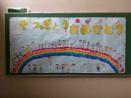 そつぎょう おめでとう 公開日 2022/03/01 更新日 2022/03/01 お知らせ 4年生の掲示板に「そつぎょう おめでとう」の掲示がされていました。虹に4年生が並んでいます。みんなで6年生のそつぎょうをお祝いしたいという思いが表れています。 いいね(0)