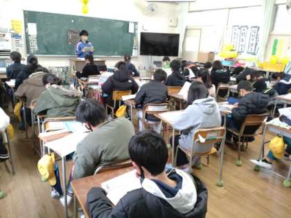 英語科のテスト 公開日 2022/03/02 更新日 2022/03/02 お知らせ 6年生は英語科のテストに取り組んでいました。テストのテーマは「what do you want to be?」です。読み・書き・ヒアリング、いろいろな力が必要です。児童は集中して、がんばっていました。中学校では本格的に英語を学習します。小学校で習って英語を忘れないようにしてほしいと思います。 テストの裏面には、「学習をふりかえろう」とあります。これからも楽しみながら学ぶ姿勢を大切にしてほしいです。 いいね(0)