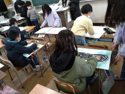 紙版画 公開日 2022/03/02 更新日 2022/03/02 お知らせ 3年生では図画工作科で作った紙版画を台紙に貼って、題名や自分の名前を付けていました。テーマは、動いている自分でしす。跳び箱・縄跳び・すべり台・サッカー、どの版画もいきいきと活動している様子がわかります。 紙版画は、画用紙で作った版にインクを刷ったあと、版を持ち上げて、きれいな新聞紙の上に移動させます。複雑な版ほどインクをつけて持ち上げるのが難しいのですが、その作品も上手に刷り上がっていました。 いいね(0)