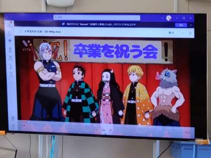 卒業祝う会で各学年が出し物をする合間に、面白いCMが流れたり、ある仕掛けが施されたりして、みんなで盛り上がって、卒業生を祝う会になりました。