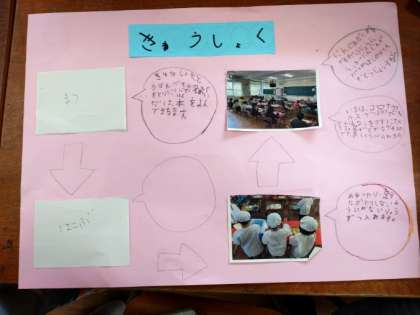 粉浜幼稚園に伝えたいこと2 公開日 2022/03/04 更新日 2022/03/04 お知らせ 色画用紙にまとめる際には、幼稚園の幼児がわかりやすいように、写真を貼ったり、吹き出しで説明を加えたりしていました。新1年生が分かるように、丁寧な字で書くように努めていました。 いいね(0)