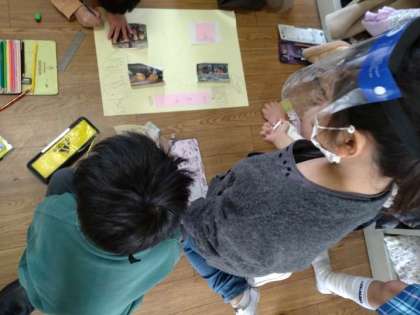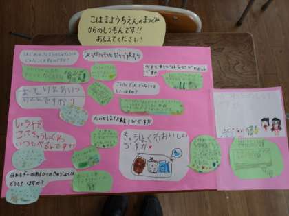 粉浜幼稚園に伝えたいこと1 公開日 2022/03/04 更新日 2022/03/04 お知らせ 1年生は、粉浜幼稚園から質問を受けていました。前時の生活科で、その回答について話し合い、下記のように吹き出しをつけて書き入れました。 本時では、粉浜幼稚園の新1年生にもっと伝えたいことを色画用紙にまとめていました。1組では「じゅぎょうのようす」「そうじ」「えん足」について、2組では「きゅうしょく」「生かつ」「タブレット」についてまとめていました。 いいね(0)