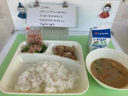 3月10日(木)の給食は、ごはん・牛乳・豚肉の生姜焼き・サツマイモのみそ汁・菜の花のおひたしです。菜の花は、色鮮やかな緑色をしたほろ苦い野菜で「なばな(菜花)」や「はなな(花菜)」ともいわれています。春が旬の野菜で、2月から3月頃に多く出回ります。