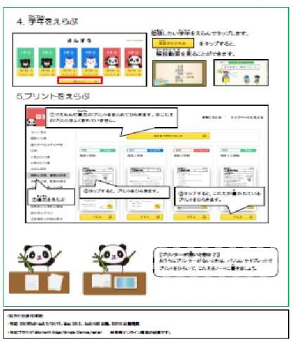 児童や保護者の方が,ご家庭のパソコン・タブレット・スマートフォンでご利用できるプリント集です。「きほんプリント」・「たしかめプリント」・「チャレンジプリント」と習熟度に合わせた3段階のプリントを用意しており,苦手な教科や単元でも無理なく家庭学習を進めることができます。