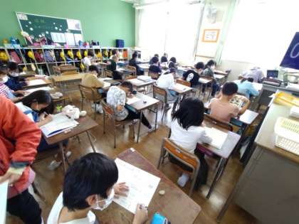 4年生は算数科で「大きい数」を学習します。まずは、新しい学習の前にプリントでこれまでの復習をしていました。3年生までに「千万」の位まで学習しています。このプリントは、結構速くできたようです。