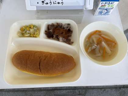 4月12日(火)の給食は、パンプキンパン・牛乳・豚肉のデミグラスソース・スープ・キャベツとコーンのソテーです。給食は、お子様の心や体が健康に成長することができるようにと、栄養のバランスが考えられています。また、給食からは、次のように様々なことを学ぶことができます。