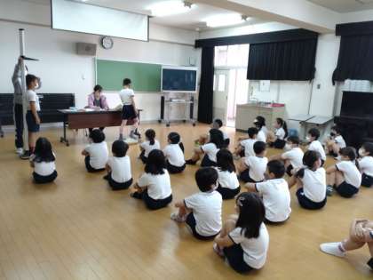 4月11日(月)は高学年、12日(火)は中学年、13日(水)は低学年の発育二測定がありました。ディスタンスをとるために多目的室で実施しています。
