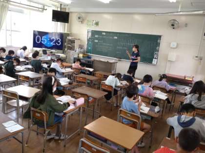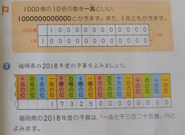 4年生では算数科で「大きい数」を学習しています。前時までに、千万よりも大きい数「億」について学んでいます。本時では、1000億よりも大きい数について考えていました。福岡圏の予算額について書き方や読み方を考えます。「兆」という言葉は、生活上すでに知っている児童が多いようです