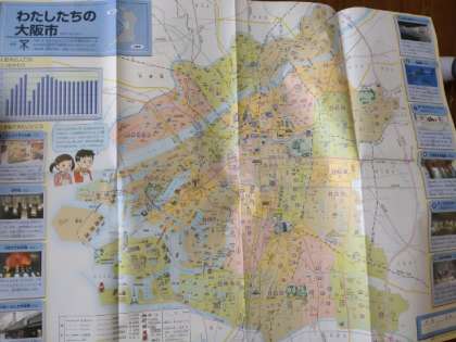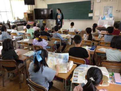 3年生は社会科で「わたしたちの住んでいる市のようす」を学習します。本時では、副読本「わたしたちの大阪(上)」についている絵地図を調べていました。大阪市の産業がわかるように大阪市の各区に分かりやすい絵が載っています。子どもたちは興味深く本を読んでいました。