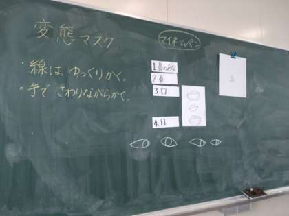 変態マスク 公開日 2022/04/14 更新日 2022/04/14 お知らせ 5年生は図画工作科で「変態マスク」の絵に取り組んでいます。顔を書く順序が決められているようです。(1)鼻の穴(2)鼻(3)口(4)目……。目を書くにしても、黒目の位置まで、口を書くにしても唇の厚さまで考えて工夫します。 また「線はゆっくりかく。」「手でさわりながらかく。」細かい約束事がありますが、素敵な絵を描くためにしっかり守って描いてほしいと思います。 いいね(0)