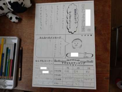 4年生では学級活動の時間に「じこしょうかい新聞」を作っていました。ワークシートに「4年生になってがんばりたいこと」「みんなへのメッセージ」「〇〇って呼んでね!」「好きなものランキング」「なんでもコーナー」が設けられていて、とても楽しい自己紹介ができます。37人の学級、お友だちのことでまだまだ知らないこともあるでしょう。