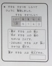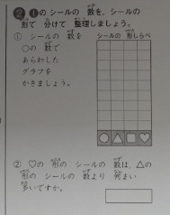 ひょうと グラフ 公開日 2022/04/15 更新日 2022/04/15 お知らせ 2年生は算数科で「ひょうと グラフ」の学習をしてきました。1組では、テストの答え合わせをしていました。シールの数を絵で分けたり形で分けたり、表に整理して数を調べることは結構できていました。表を作成した後で、「いちごの絵のシールの数は、りんごの絵のシールの数より何まい多いですか。」と問われて、戸惑った児童もいたようです。 発展問題で、表の一部分の数字が「?」になって解く問題もありました。 いいね(0)