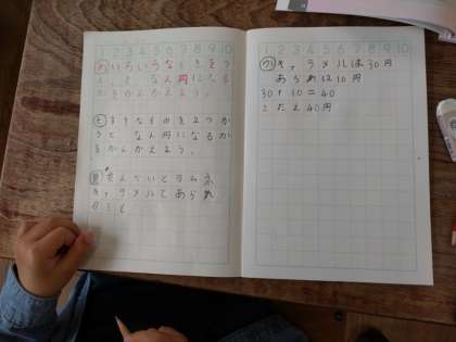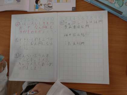 あわせて なん円かな2 公開日 2022/04/18 更新日 2022/04/18 お知らせ 子どもたちは「〇〇と□□を選ぶ。」場合に、どんな式で求められ、何円になるのかを考えていきました。「〇〇は( )円、□□は【 】円、( )+【 】=〔 〕、こたえ〔 〕円」考えを展開していきました。 たし算で計算するようですが、2けた+2けたの足し算になります。どのように計算すればいいのかをこれから考えていきます。 いいね(0)