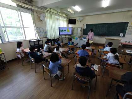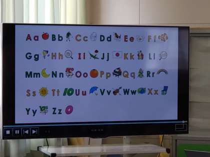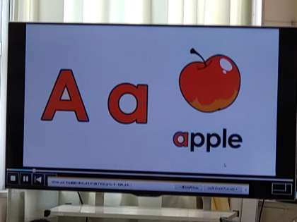 2年生は水曜日の朝タイム、英語活動をしています。大型テレビに、大文字小文字のアルファベット、そのアルファベットを使った英単語と絵が映し出されます。2組では「A、A、ぁ、ぁ、ぁ、apple」のように、音楽に合わせて発音していました。「violin」の「V」の発音もそれらしく……。