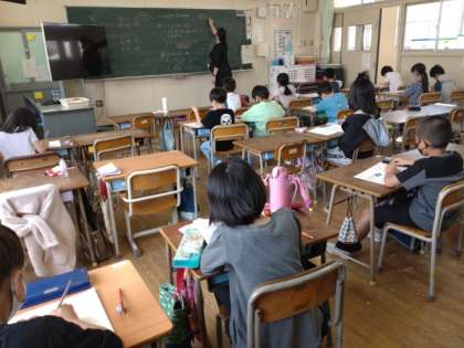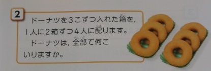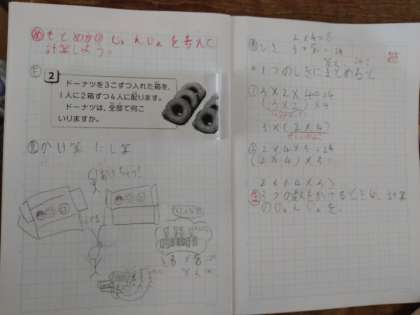 3年生は算数科で「かけ算」を学習しています。本時では、次のような問題について考えていました。「一人分のドーナツの数を求めて……。」と「まず箱の数を求めて……。」大きく2つの考え方があるようです。児童は、自分の考えをノートに、文章や図・絵に表していました。