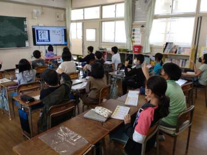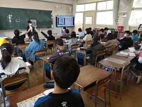 5年2組では国語科の時間に新出漢字を学んでいました。前に出た担当の児童が、漢字ドリルを使って、熟語や例文を読み上げたり、書き順を確認したり、学びを進めていきます。自分たちで学習を進めることで、自主学習につながって、より確かな学びにつながることと思います。