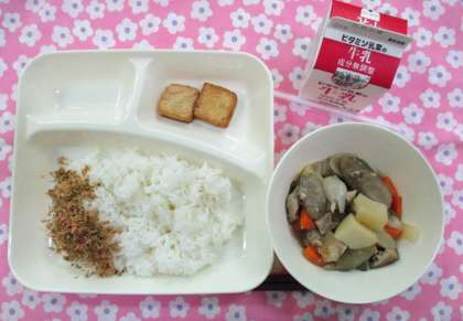 4月21日(木)の給食は、ごはん・牛乳・鶏肉とじゃがいもの煮もの・あつあげのしょうゆだれかけ・紅ざけそぼろです。給食の紅ざけそぼろは、紅鮭といりごま、あおのりを炒って作ります。(水分がなくなるまで食材に火を通しています。素材の味を活かすため、料理酒・みりん・うすくちしょうゆだけで味付けしています。いりごまとあおのりの風味も味わうことができます。ご飯がより美味しく感じられ、食がとても進みます。