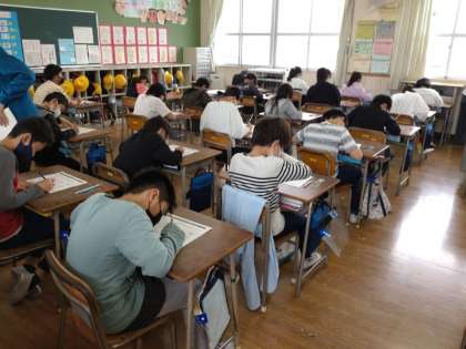 4月1日(木)5年生が、大阪府の学力調査「すくすくウオッチ」、国語・算数・理科・わくわく問題・児童質問紙を受けました。国語・算数・理科は各20分です。時間の配分に気をつけなければいけません。時間切れにならないようにがんばってほしいと思います。