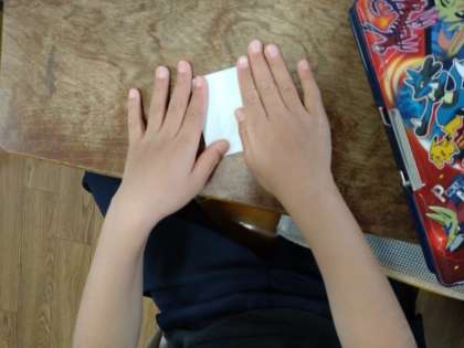 アジサイの花作り 公開日 2022/04/21 更新日 2022/04/21 お知らせ 2年生が5月の掲示物を作っています。2組では、水色や紫色の折り紙を使ってアジサイの花を作っていました。1枚目は、作り方を覚えるために先生の合図に合わせて、全体で一緒に作っていきます。うまく折れたら、仕上げのアイロンがけ(掌で押さえて平らにする)です。できたら、2枚目からは自分のペースで作るようです。 この後、音楽科で習っている「小犬のビンゴ」を歌っていました。 いいね(0)