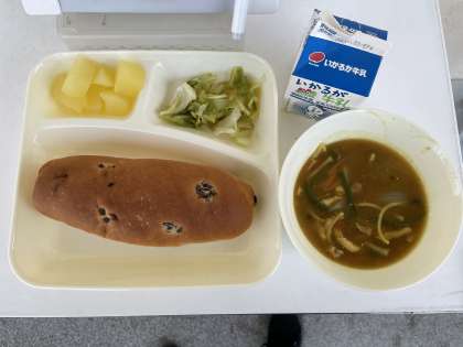 4月22日(金)の給食は、レーズンパン・牛乳・カレースープスパゲッティ・キャベツのピクルス・りんご(カット缶)です。キャベツは、葉の部分を食べる野菜です。涼しい所で育ちます。特に春のキャベツは葉が柔らかいです。風邪などのウイルスから体を守るビタミンCが多く含まれています。甘酸っぱくて爽やかな味です。