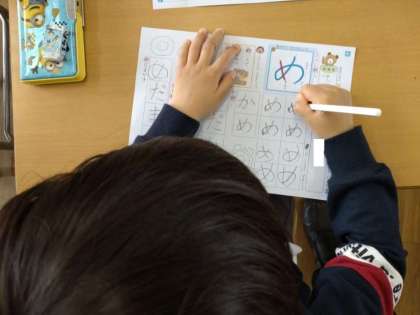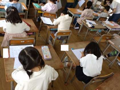 1年生は国語科で、ひらがな「か」と「め」を学んでいました。就学前に、すでに知っている児童も少なくないようですが、「か」の左部分が大きすぎて、左右のバランスがよくなかったり、「め」の2画目の曲がり方がよくなかったり、悪い癖がついていることがあります。もう一度初心に戻って学び直しています。
