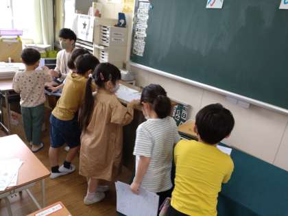 ワークシートができた児童は、先生の前に並んで丸付けしてもらいます。うまく書けた時には花丸がもらえて、にこにこでした。