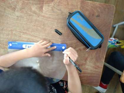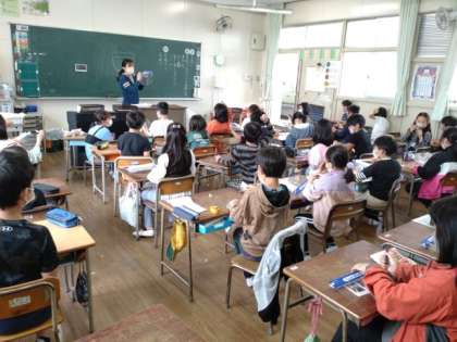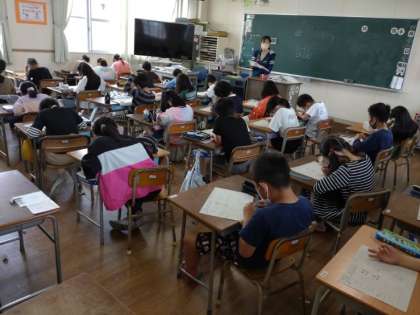 4年生では新しいフェイスシールドが配られていました。1年間使うものなので、各自で丁寧に名前を書き入れます。先生から、フェイスシールドの尋ね方について問いかけられると、「グループで相談するときに使う。」「音楽で歌や演奏をするときに使う。」など、これまでの経験を思い出して発表されました。