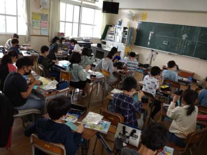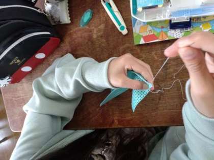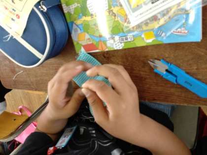 玉結び 公開日 2022/04/25 更新日 2022/04/25 お知らせ 5年生は家庭科で「ソーイング はじめの一歩」を学習しています。2組では、練習布を使って「玉結び」の練習をしていました。針の穴に糸を通すところから、なかなか難しいようです。やっと準備OK、練習布に針を刺して、針の周りに糸をくるくる巻いて、「それっ」と引っ張ったところが、「あれれ」と抜けてしまった児童もいたようです。 粘り強く、あきらめずに練習していました。 いいね(0)