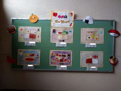 1年生の掲示板に、図画工作科で描いた「ゆめの きゅうしょく」が貼られていました。お皿には、児童が大好きな「カレーライス」「オムライス」「ハンバーグ」などがのせられています。フルーツ、デザートなど、好きなメニューばかりの、まさしく夢の給食でした。