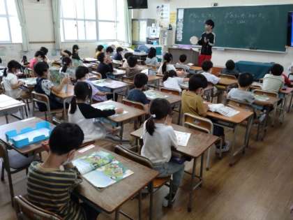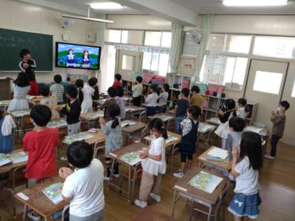 続いて日本の歌「ひらいた ひらいた」を学習します。大型テレビに歌いながら踊る画像が映し出されています。それを観ながら、児童も立ち上がって歌いながら、つぼみから花が咲く様子を手で表していました。