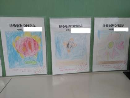 教室の後ろには、きれいな花を描いた生活科「はるを みつけたよ」のワークシートが貼られていました。