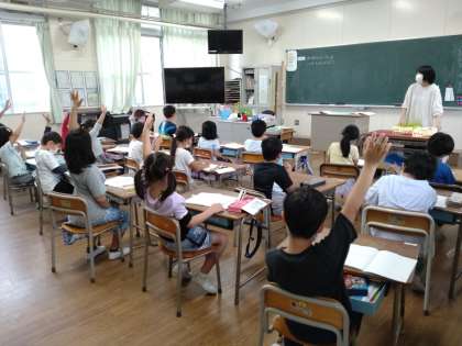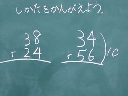 2年生では算数科で「たし算」について学習しています。前時では、2けた+2けたのひっ算で、一の位の答えが10より大きくなるときについて考えていました。2組では、「34+56」のような場合について考えます。