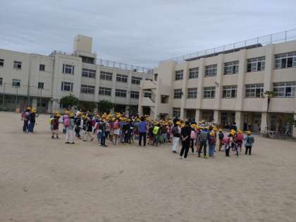 最後に運動場に地区別に並び、集団下校しました。災害などの緊急時には集団下校するので、速やかに並べるように練習しました。