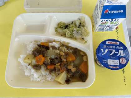 5月2日(月)の給食は、牛肉と大豆のカレーライス・牛乳・キャベツのひじきドレッシング・ヨーグルトです。大豆は、たんぱく質を多く含んでいるので「畑の肉」とも呼ばれています。タンパク質は、肉に多く含まれている栄養素です。大豆は、たんぱく質のほかにもビタミンやカルシウム・鉄なども含んだ栄養価の高い食品です。子どもたちが大好きなカレーに大豆が加わることで、栄養面でもかなり充実した料理になっています。今週ゴールデンウイーク後半は気温が高くなる予報です。大豆カレーパワーで乗り越えてほしいと思います。