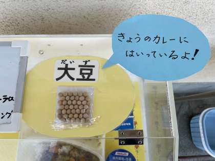 2枚目の写真は、給食室の前に子どもたちにもわかりやすいように大豆を展示している様子です。