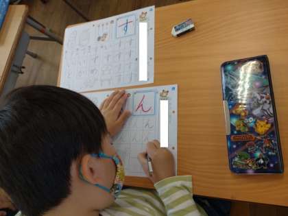 1年生は国語科で、ひらがな「す」と「ん」を習っていました。「す」は2画目が中央の縦線よりも少し右に、また、「す」「ん」とも曲がり具合や払う方向に気をつけて……。児童は集中してワークシートに練習していました。