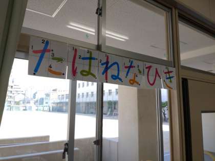 書き終えると先生の机まで見せに行きます。少し列ができたときには、押さないように、前の人と間をあけるようにしています。先生から丸をもらうと、とても嬉しそうでした。教室横には、習い終わったひらがなが掲示されています。