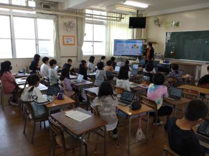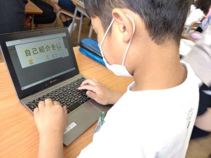 4年生はタブレットの発表ノートの機能を使って、自己紹介のプレゼントを作成していきます。「はまっていること」「将来の夢」「行ってみたい場所」「好きなテレビやアニメ」……。ページに制限はないようです。これまでの積み重ねがあり、操作に慣れてきたのでしょう。説明を受けると、多くの児童がすぐにとりかかっていました。