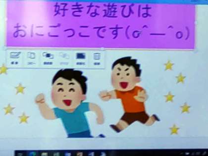 質問が出ました。大型テレビ画面に示された例に「(○^—^○)」とありました。絵のような、図のような、記号のような?」このような「絵文字?」も工夫しながら、より興味深いプレゼンを作ってほしいです。
